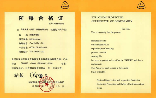 防爆熱電阻領(lǐng)取了由國家級儀器儀表防爆安全監(jiān)督檢驗(yàn)站出具的防爆合格證