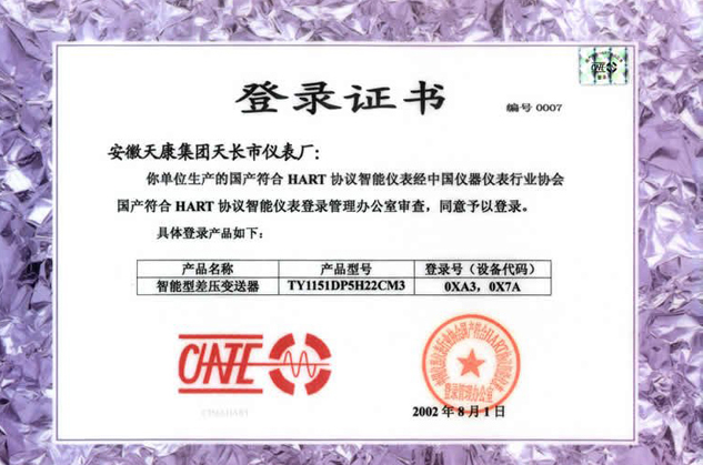 智能型差壓變送器獲儀表行業(yè)登錄管理辦公室頒發(fā)的登錄證書