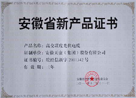 安徽省新產(chǎn)品證書(shū)-高交聯(lián)度光伏電纜