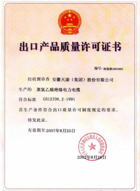 聚氯乙烯絕緣電力電纜獲中華人民共和國安徽出入境檢驗檢疫局評定的產(chǎn)品質(zhì)量許可證書