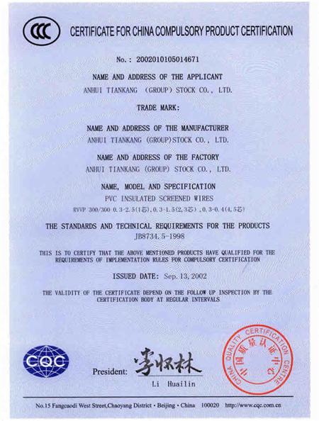 聚氯乙烯絕緣屏蔽電線被中國質量認證中心評為中國國家強制生產(chǎn)產(chǎn)品認證證書英文版
