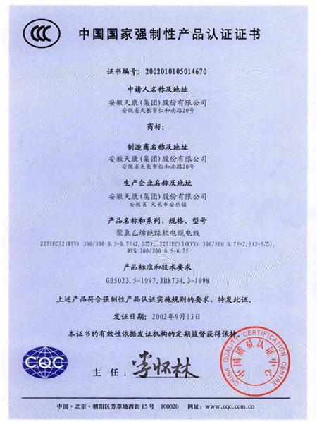 聚氯乙烯絕緣軟電纜電線被中國質(zhì)量認證中心評為中國國家強制生產(chǎn)產(chǎn)品認證證書