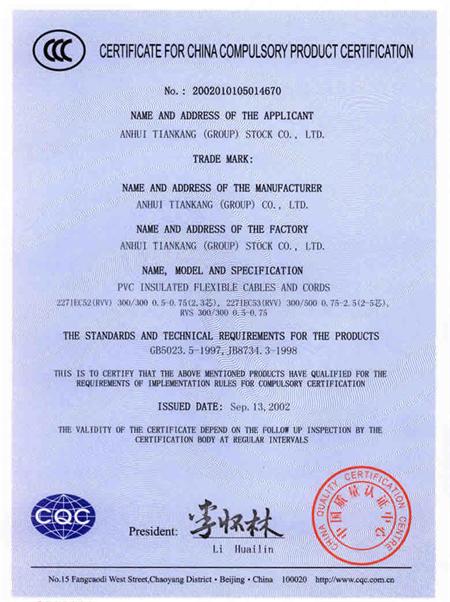 聚氯乙烯絕緣軟電纜電線被中國質(zhì)量認證中心評為中國國家強制生產(chǎn)產(chǎn)品認證證書英文版