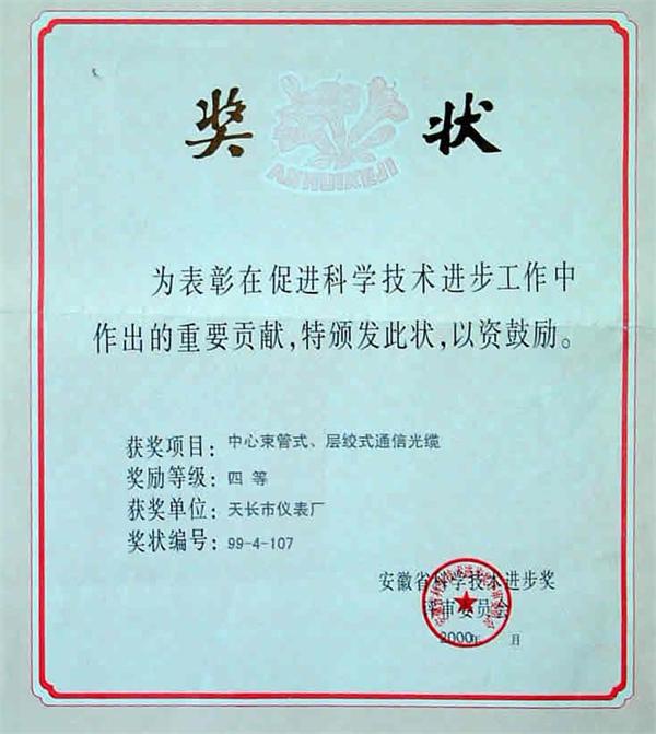 中心束管式、層絞式通信光纜于2000年獲安徽省科學(xué)技術(shù)進步四等獎