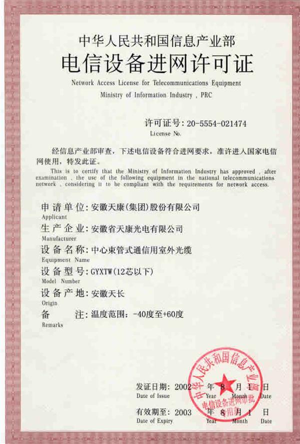 中心束管式通信用室外光纜獲中華人民共和國信息產業(yè)部進網許可證