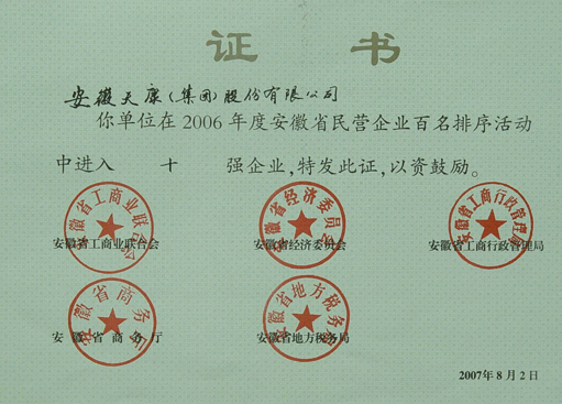 06年安徽省民營(yíng)十強(qiáng)企業(yè)證書(shū)